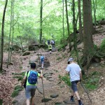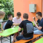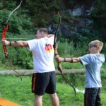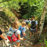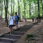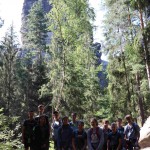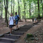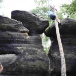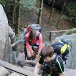 Am Mittwoch quälten sich alle sehr früh aus den Betten um sich für die Wanderung über den Klettersteig „Häntschelstiege“ zu rüsten. Nach einer kurzen Fahrt zum Beuthenfall, der Startpunkt unserer Wanderung, folgten wir einen schmalen Pfad bis zu den 60 m herausragenden Sandsteinfelsen. Mit viel Mut und Selbstvertrauen ausgestattet, nahmen alle die Stiege in luftiger Höhe in Angriff. Hier zahlte sich die bereits gewonnene Erfahrung der vorherigen Kletteraktionen voll aus. Nach einstündigem Aufstieg konnten alle bei bestem Wetter gemeinsam den herrlichen Ausblick auf die umliegende Landschaft genießen. Anschließend konnten sich noch alle am kleinen Turmfelsen versuchen und eine Birke als Rutsche zum Abstieg benutzen ähnlich wie eine Feuerwehrstange. Nach einer kurzen Strecke mit einigen Aussichtspunkten auf dem Plateau ging es auch schon wieder abwärts durch die „Wilde Hölle“. Auch hier mussten wir Klettersteige meistern und gelangten durch ein ausgewaschenes Flussbett über große Steine zurück ins Tal. Am Ende des Tages gab es als Belohnung für alle noch sehr leckere Marshmallow, welche im Bruchteil einer Sekunde verschwunden waren. Bis zur Geisterstunde wurde am Lagerfeuer gemütlich beisammen gesessen und mit vielen lustigen Geschichten die Nacht zum Tage gemacht.